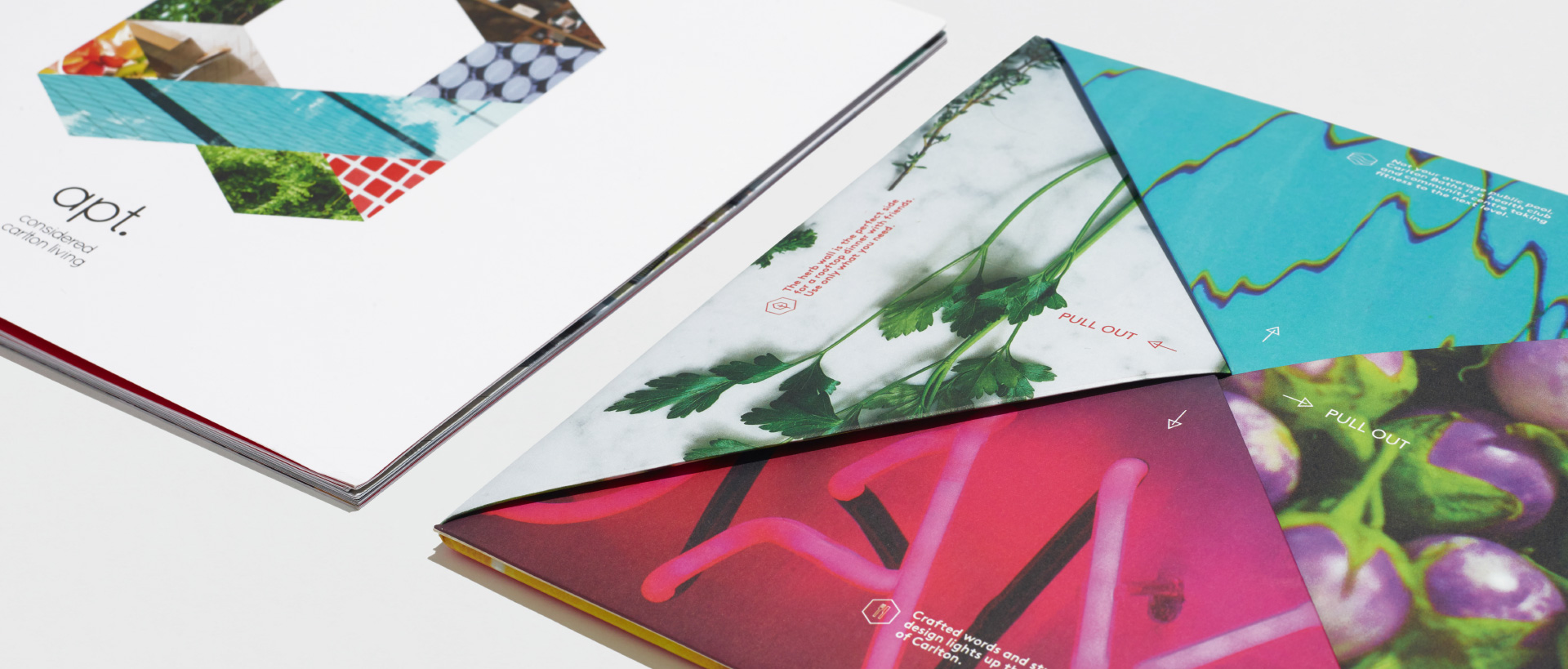 Invited to contribute at the building design stage, we forged a strong USP by helping integrate space optimising furniture and storage ideas into the apartment floor plans, and a plethora of smart resident amenities throughout communal areas. ‘Small but perfectly considered’ became our mantra for the communications design that followed. The brand ‘apt’, we abbreviated from the word ‘apartment’. Its chameleonic wordmark, we derived from a basic cube. And the deceptively simple square collateral? An origami brochure cover that unfolded to reveal a map of the area. All an embodiment of 'Considered Carlton Living'.